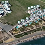 Die 3-Zimmer- Serenity Waves Villa 12 Softades verfügt über eine Terrasse mit Aussicht aufs Meer sowie einen Swimmingpool.